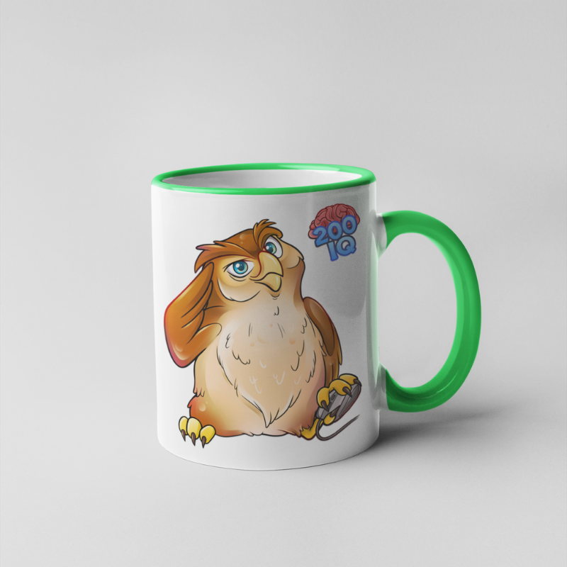 Biały kubek ceramiczny z kolorowym uchem – grafika „200 IQ SOWA”